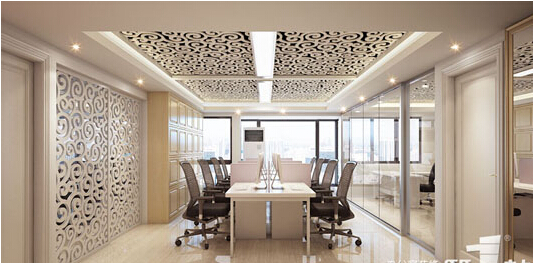 就是新的元素和中式的元素的巧妙地結合,采用了沉穩的裝修路線,還有雕刻的天花造型和高隔斷等等。這是該紡織城辦公室裝修的案例中它的會議區的裝修,以此來表現企業的高大的形象,這很精致。