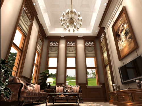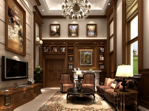 工程說明:別墅設計不僅僅考慮的是別墅居住者的生活習慣及各種風格的搭調,同時還要考慮別墅設計的外在元素。地面大理石拼鋪,深色木質扶手的家具,挑空的層高,歐式的壁爐和歐式木質造型,整個客廳空間就營造出一種沉穩大氣的氛圍。帶著美式風格的粗獷大氣和韻味,